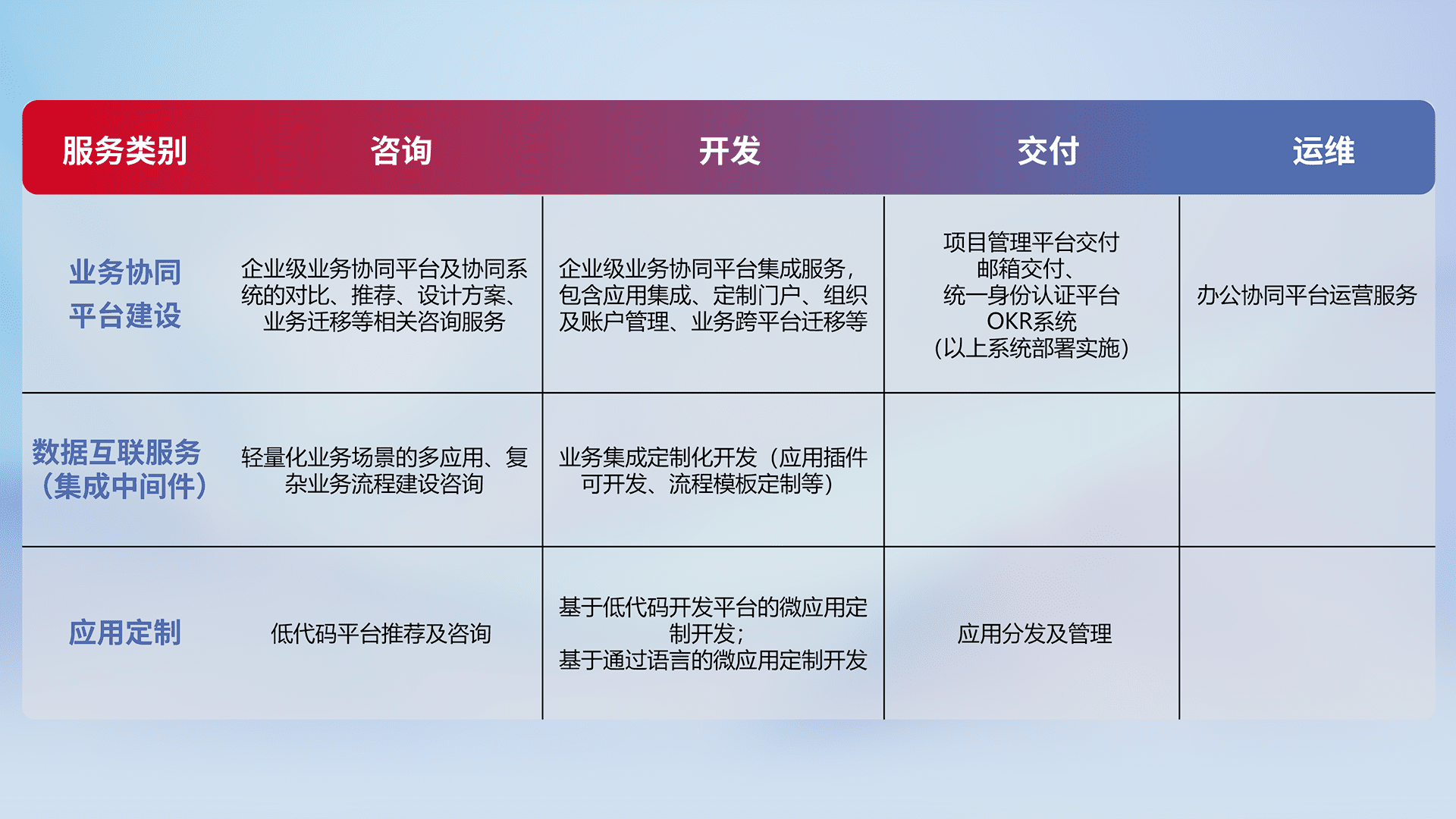 针对钉钉、、企微、、、、IDaas等平台级产品提供产品的规划、、、、方案、、交付、、、定制化开发等服务,,实现如统一协同办公、、、智能客户服务、、、、混合会议管理、、、、智能数据查询、、、、等业务场景,,实现数字化转型。。